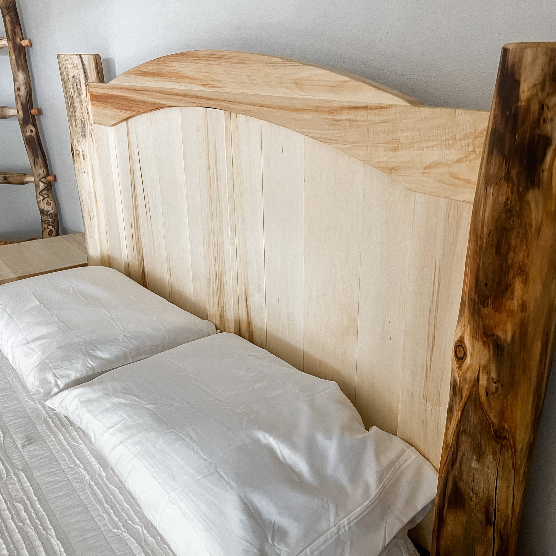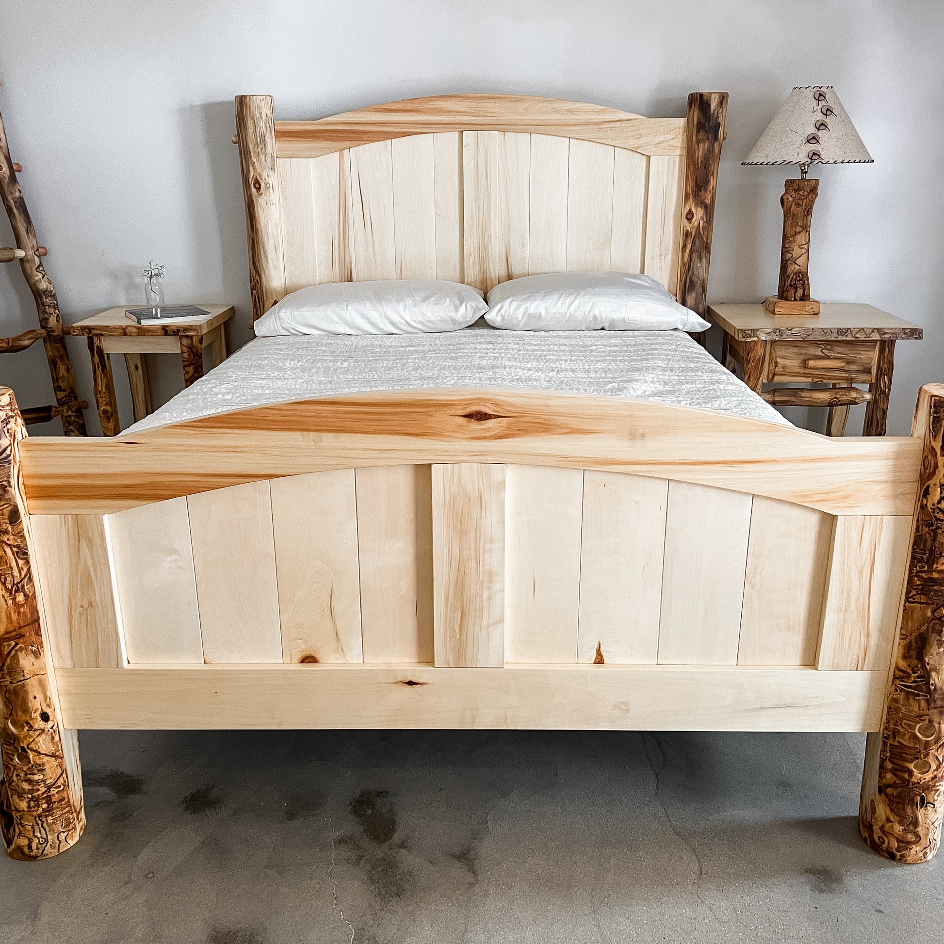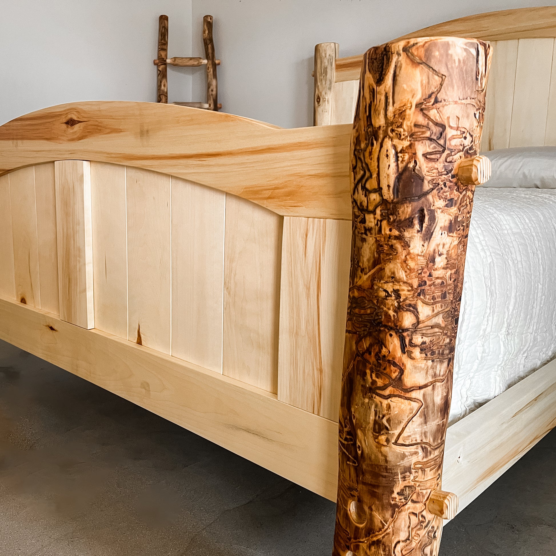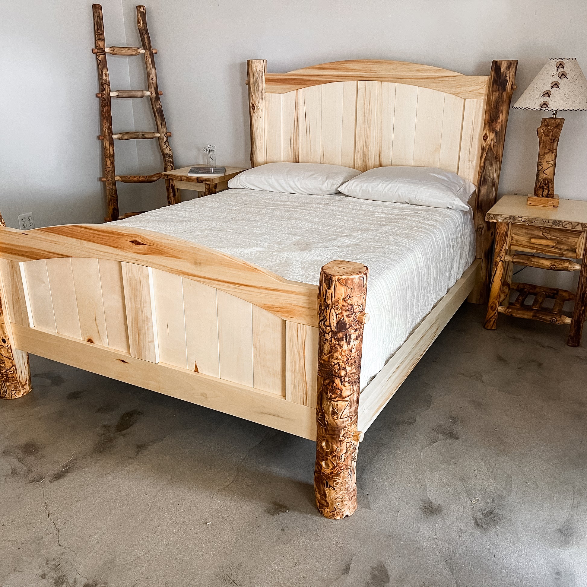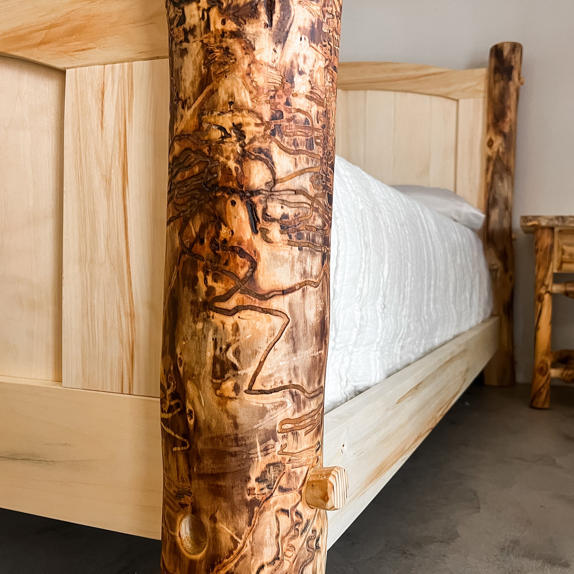 This one-of-a-kind aspen / Aspen bed is crafted from reclaimed wood, sourced locally from old barns, abandoned structures, or dead standing aspen / pine timbers.