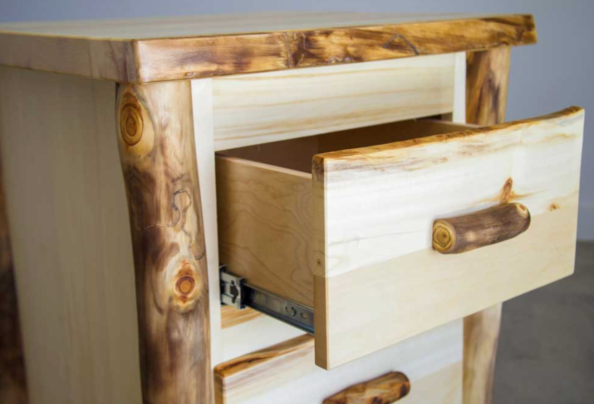 This 2 drawer nightstand is made of rustic, locally-sourced aspen and boasts aspen log trim, natural edged drawer fronts, and log drawer pulls.