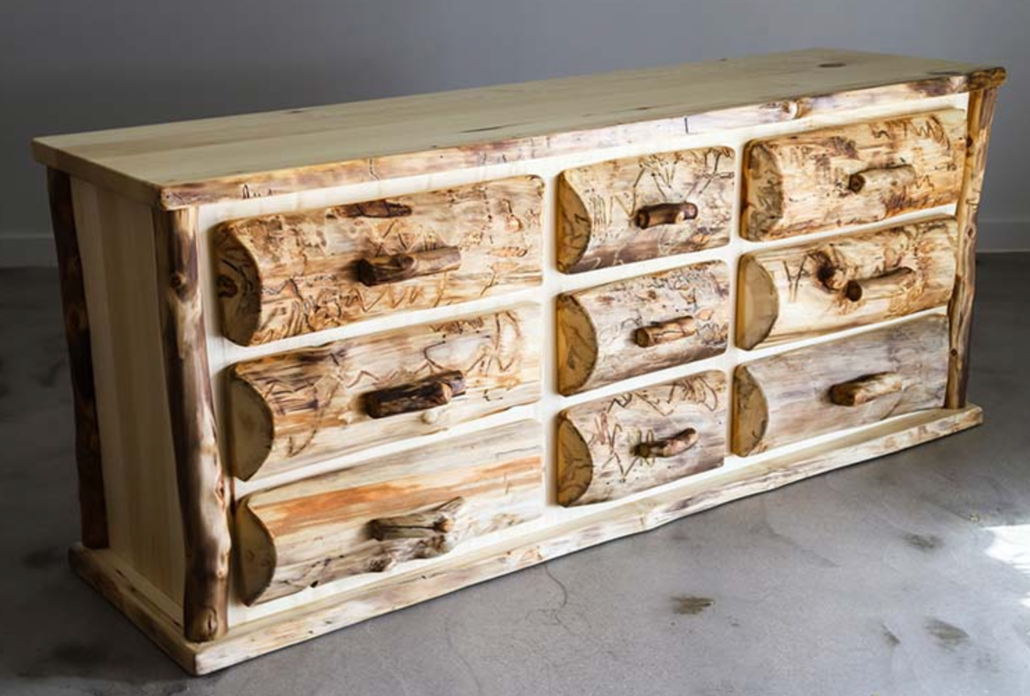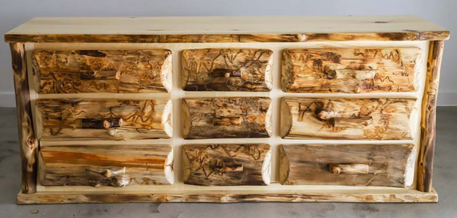 Our Kodiak 9 Drawer Dresser is crafted from local dead standing aspen, featuring half log drawer fronts and curvy drawer pulls.